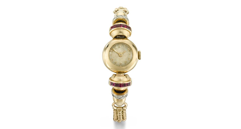 Rounding out some of the top jewelry lots was a wristwatch that likely was a gift from Olivier to Leigh for Christmas 1940, their first as a married couple. It features a manual winding movement, a circular dial with Arabic numeral indicators and shoulders set with calibré-cut rubies and single-cut diamonds, as well as an engraving on the reverse side that reads, “Vivien Larry Only!! Darling Xmas 1940.”