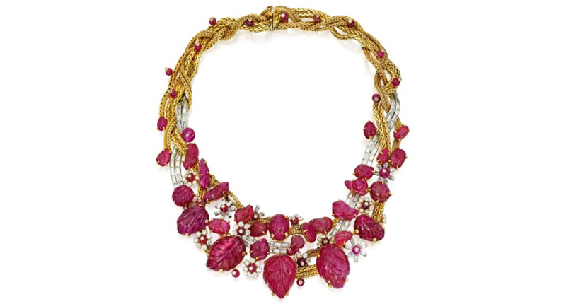 This was followed closely by the circa 1950 Marchak necklace seen below, composed of braided gold rope work, interspersed with baguette diamonds and embellished with carved rubies and floral motifs set with ruby beads and round and baguette diamonds. It garnered $100,000.
