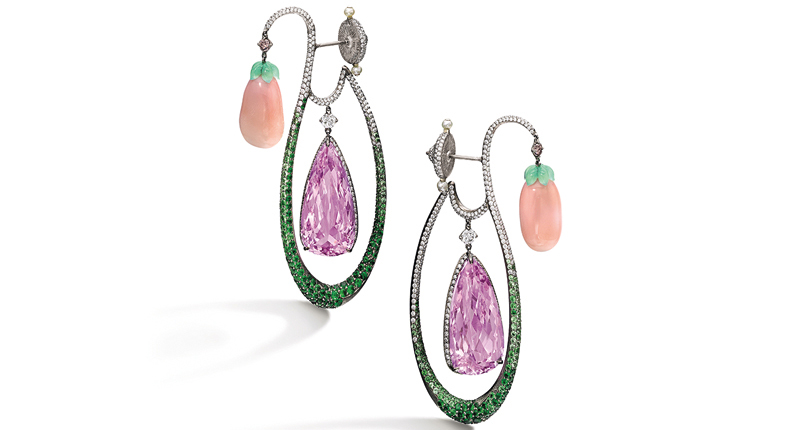 The jewelry auction also will have a section featuring works created by celebrated Asian contemporary designer Wallace Chan. This includes the tanzanite, chalcedony and diamond ring seen below, which could sell for as much as $230,000, as well as the earrings pictured below featuring conch pearl, gems and diamonds, which could sell for between $281,000 and $408,000.