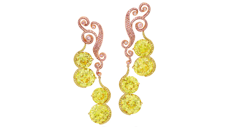 In addition to the Ai diamond, the jewelry auction will feature a pair of earrings with old European brilliant-cut fancy vivid yellow diamonds weighing 51.17 carats total—“well-matched” in color, ton and saturation, Sotheby’s said—accented with white diamonds. They are designed to depict a fruitful harvest of melons flowering from their vines.