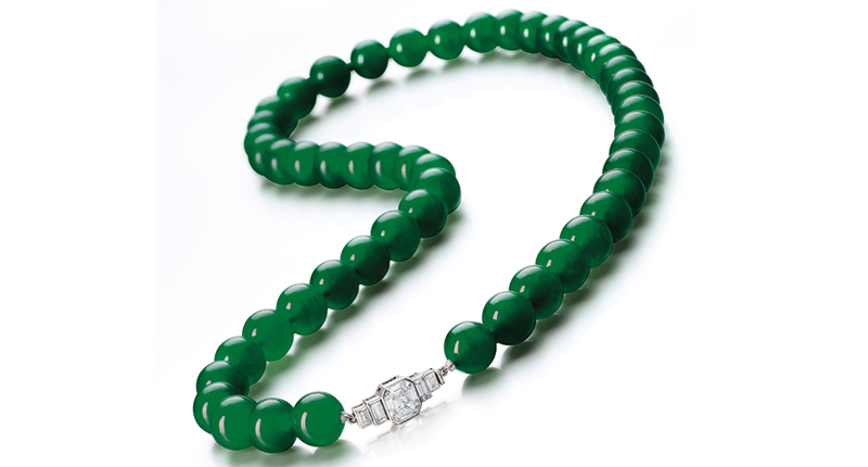 There also will be a number of important jade pieces, including a necklace composed of 51 jadeite beads of a brilliant emerald green color and with “very good” translucency, with a diamond clasp signed Chaumet. Pictured below, its pre-sale estimate is available upon request by Sotheby’s.