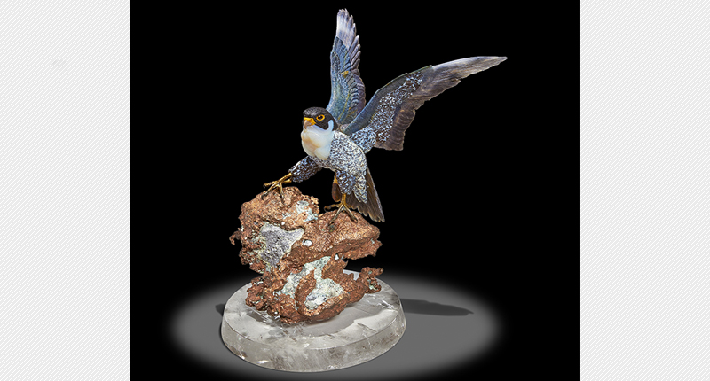 The falcon sits on top of a copper specimen with some traces of quartz, designed to mimic a mountainous outcropping, and is raised on a circular rock crystal quartz base.