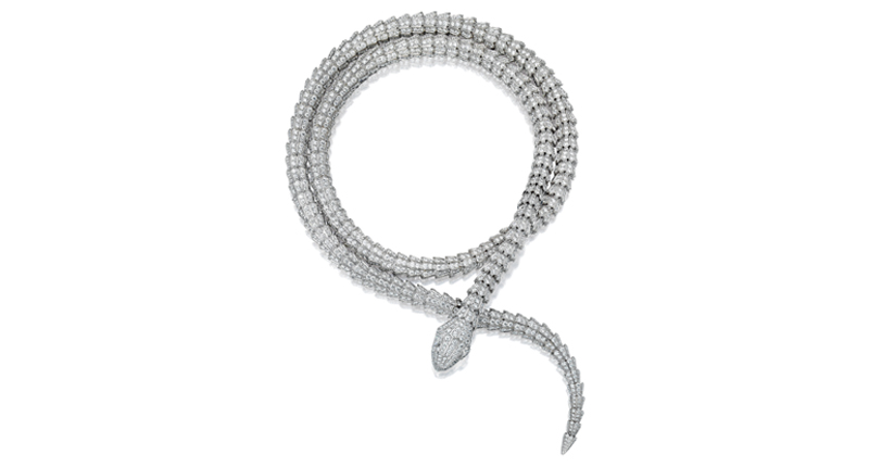 Sotheby’s Luxury Division Sales Director Frank Everett said in a press release: “Bulgari has been reinventing the ‘Serpenti’ jewels for decades, first with the gold tubogas watches that wrap and climb the wrist, later with colored enamel ‘scales,’ and now in fully-pavéd diamond contemporary pieces.