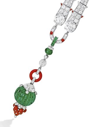 A diamond, coral, emerald and seed pearl pendeloque brooch from Tiffany & Co., seen at right, more than doubled its highest pre-sale estimate, $350,000, to garner $824,000 in the jewelry auction.