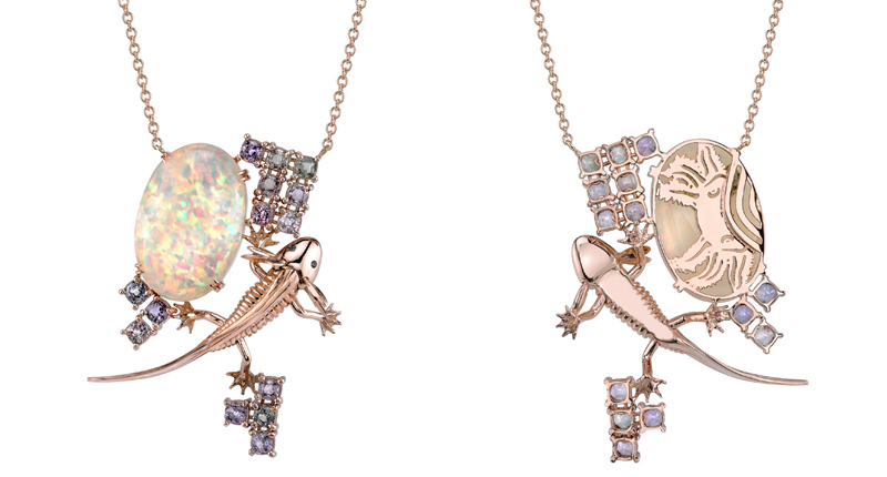 This pendant is made of 18-karat rose gold, opal and various colors of spinel. As the wearer moves, the legs and tail of the salamander move as well.