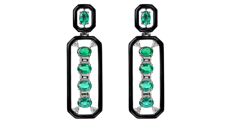 Nikos Koulis will display new additions to his popular “Oui” collection in Vicenza. In these earrings, the Greek designer employs his beloved, striking color combination of 18-karat white gold, black enamel, white diamonds and glowing green emeralds (which just happen to be Koulis’ favorite stone).