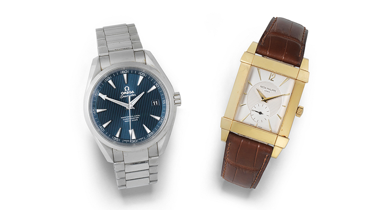 There also will be a stainless-steel Omega Seamaster Co-Axial Aqua Terra, estimated to sell between $1,200 and $1,900; and an 18-karat gold rectangular Patek Philippe Gondolo, Ref. 5111, estimated at $5,000 to $7,000. Both are pictured below.
