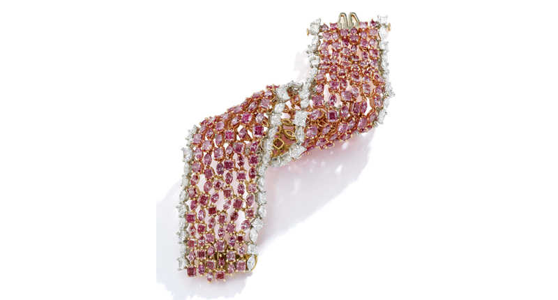 The above “Majestic Pink,” a fancy colored diamond and diamond bracelet features 204 radiant- and marquise-shaped pink and red diamonds totaling 43.34 carats in a setting by Carvin French, was estimated to sell for at least $3 million but found no takers.