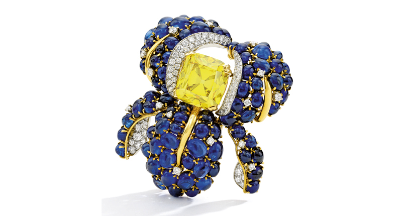 Commissioned in 1999, it features a 14.37-carat square brilliant-cut fancy vivid yellow diamond surrounded by cabochon sapphires and colorless diamonds.