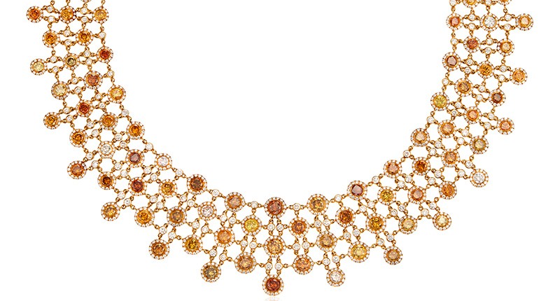 The top lot of the sale (pictured below) is a 20.21-carat pear-shaped yellow-brown diamond framed by round diamonds and suspended from a graduated diamond necklace by Graff. It’s estimated to garner between $300,000 and $400,000.