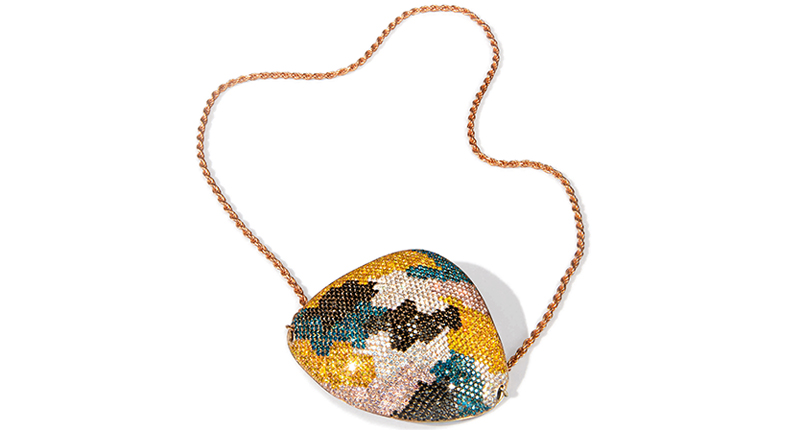 Made by Jacob the Jeweler according to a design created by Slick Rick’s wife and manager for his 40th birthday, the eye patch has 20 carats of round near-colorless and colored diamonds in pink, yellow, blue-green and black.