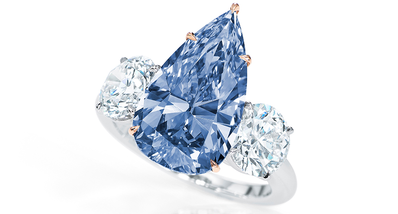 Another expected top lot of the sale is a ring featuring a 4.84-carat fancy vivid blue internally flawless pear-shaped diamond with two brilliant-cut diamond accents weighing 1.10 carats each in platinum and pink gold.