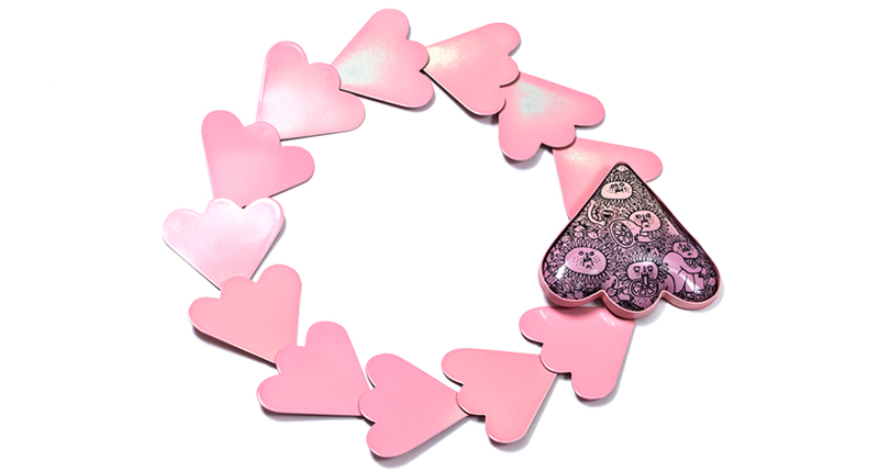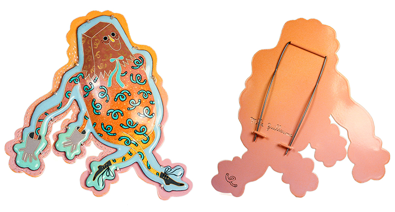 All of her pieces begin with an illustration central to her work and through the use of enamel paired with the whimsical nature of these characters, “confronts the high art form of jewelry with lowbrow humor,” her bio states.