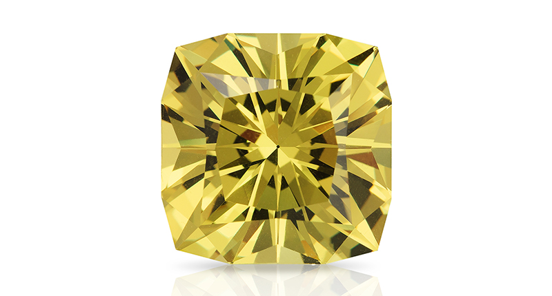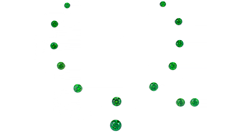 A suite of round brilliant Russian demantoid garnets weighing a total of 24.67 carats cut by Ruben Bindra of B&B Fine Gems was recognized with the design contest’s highest honor.