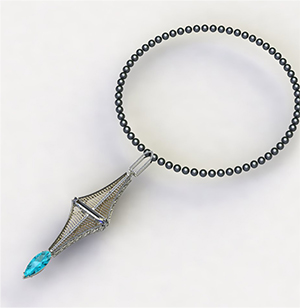 Smiddy won the first day’s competition. He designed a necklace inspired by the architecture of the Brooklyn Bridge and that featured a Paraiba tourmaline drop to reflect the water surrounding the iconic structure.