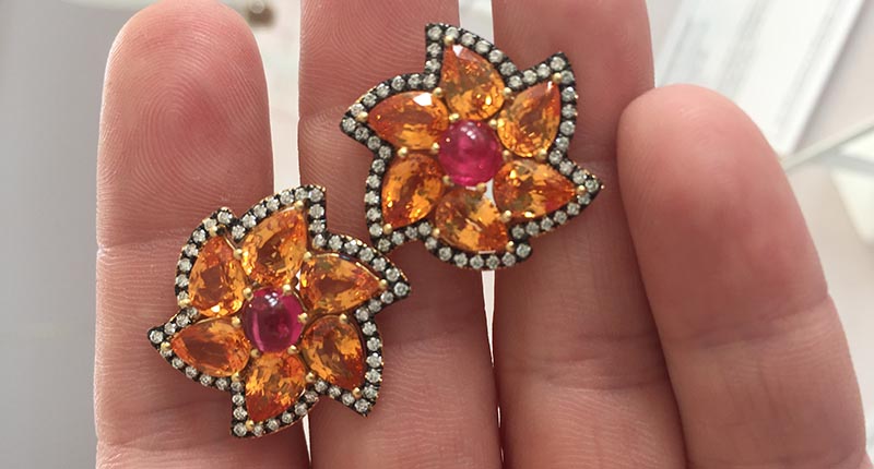 Bella Campbell of Campbellian Collection knows how to pick gems, how to pair them and how to set them. I love the vibrancy of the orange in the spessartite garnets in these earrings and the cabochon spinel in the center. The black rhodium over 18-karat gold gives them a little edge to create a pair of earrings I think anyone would be happy to wear in the warm days of summer.