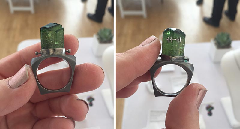 Readers, meet “Frankenstein.” I grabbed this piece, which is 14-karat white gold with rhodium and black rhodium plating, off the table to take a look at the green chrome tourmaline crystal and then saw the wiring in the back. Confused, I looked down at the label, saw that it was titled “Frankenstein,” turned the piece around to take a look, and then cackled once I took it all in. I love the creativity behind this piece and its sense of humor. Thanks for that treat, Jennifer Kellogg. I’m a fan.