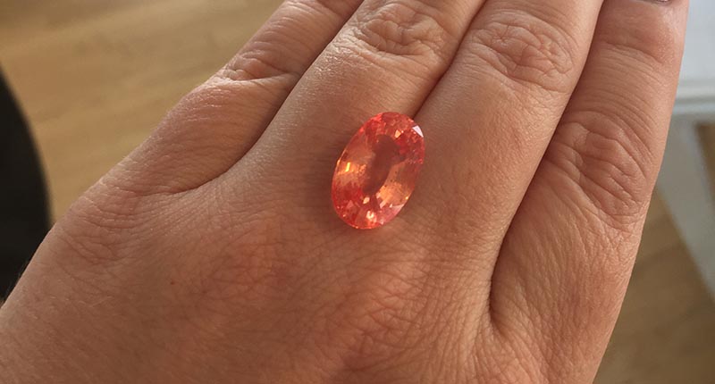 That title may be hyperbole, but I’m going to be optimistic and pretend like it’s not. It’s amazing how stones can elicit such strong reactions from people, and this 12.56-carat unheated Ceylon padparadscha sapphire--honorable mention winner in the Classic Gemstone Cutting Edge category--swept me off my feet. The color and saturation were out of this world and kept drawing me back, like a moth to a flame. After I got to hold it, I looped back around to the display case a few more times just to see it again.