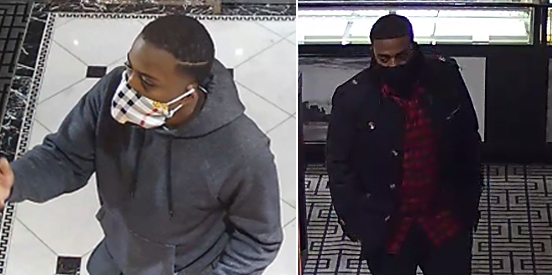 Suspect one is described as a male in his late teens to mid-20s, of medium build and unknown height. He was last seen wearing a black and white checkered face mask, gray hoodie, and gray sweatpants.