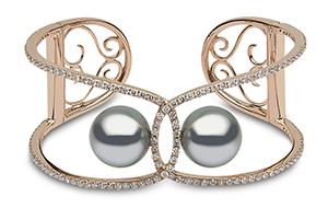 Yoko London unveiled a number of new jewels at the show, including on-trend items like ear jackets and multi-finger rings and pieces where its pearls are set with black or rose gold.