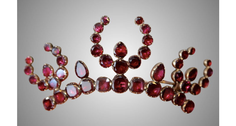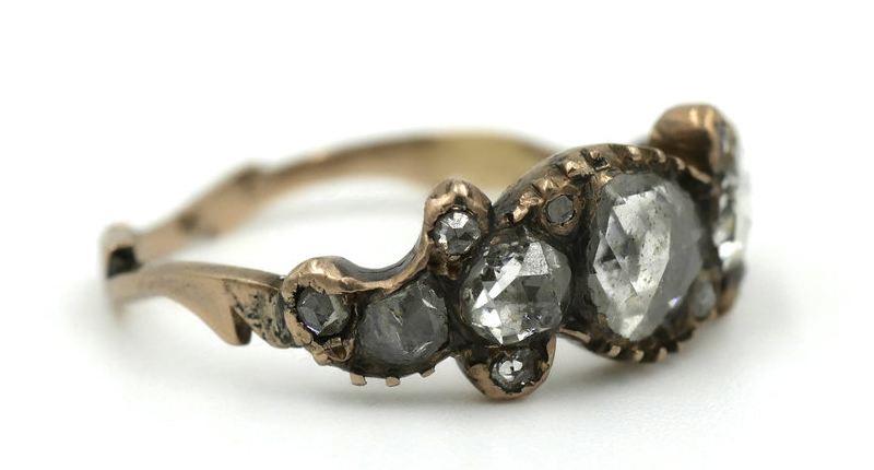 Potts said that the use of closed-back settings for diamonds and gemstones is a technical hallmark of the period. “Diamonds, garnets, agates and other gemstones were often placed in their settings with a thin piece of metal or ‘foil’ backing it to help the light reflect through the stone,” she said. “Open settings weren’t really used quite yet. Over time, the backings have mostly oxidized to create this really breathtaking, moody look to the diamonds.”