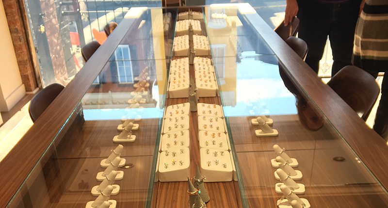 The four-section table is in an area of the store dubbed the “invitation space.” Customers are free to grab the brass-and-glass samples in the middle and try them on; underneath the glass are more ring styles (sterling silver and cubic zirconia samples) as well as stones that illustrate diamond size.