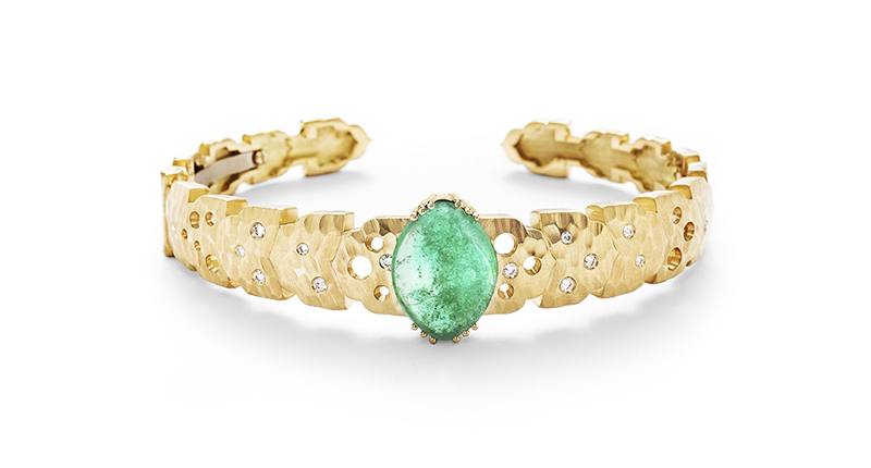 Dana Bronfman’s work has this great, subtle sculptural feeling that she softens with open spaces, and I love the way the tumbled Muzo emeralds she uses provide a contrast to that, especially in this “Marquise Agra” cuff ($11,300).