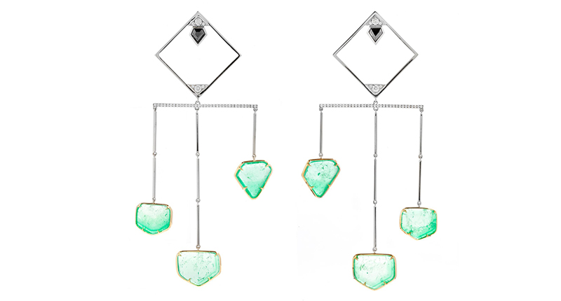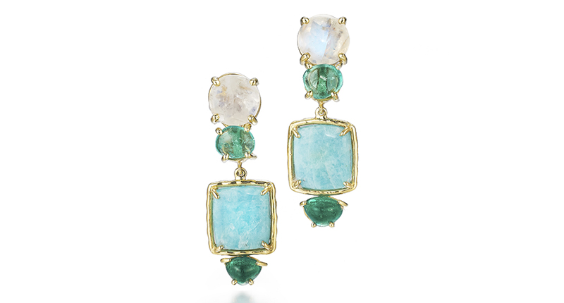 In one set of earrings, she paired the emeralds with iolite and azurite-malachite; in another, aquamarine, tourmaline and white howlite. This pair above, priced at $6,500, features free-form emeralds and trillion cabochons with rainbow moonstone and amazonite set in 18-karat gold.