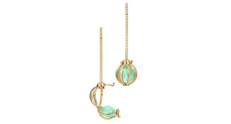 I love the versatility of the tumbled emeralds she used here. These 18-karat gold cages can be opened for other gems, if you wish, and the emeralds also are sold separately ($3,600 for the pair, while the earrings are $5,720).