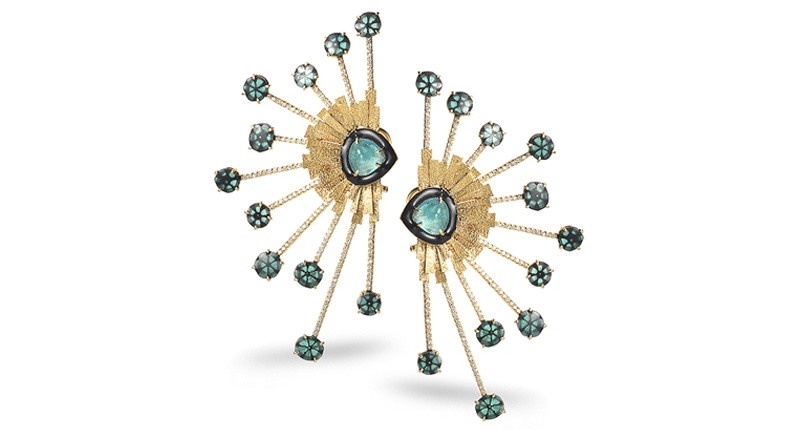 RELATED CONTENT: 5 Things to Know About … Trapiche GemsCoomi’s “Bloom” earrings, featuring 13.20 carats of trapiche emerald, 3.30 carats of cabochon emerald and 1.05 carats of diamond in 20-karat gold, took already exceptionally cool stones and made them even cooler by setting them in such a show-stopping way. They’re priced at $69,000. (Visit our Instagram to see them on.)