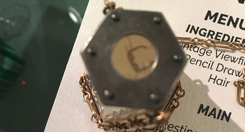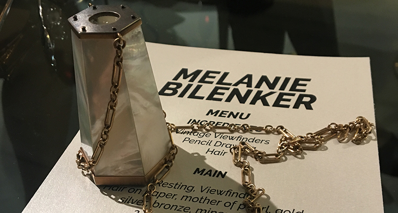 Intrigued by a card that mentioned vintage viewfinders, I took a seat at the mid-century modern table where Philadelphia-based jewelry artist Melanie Bilenker was presenting her work.
