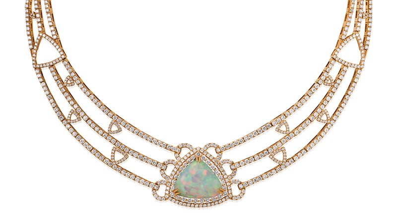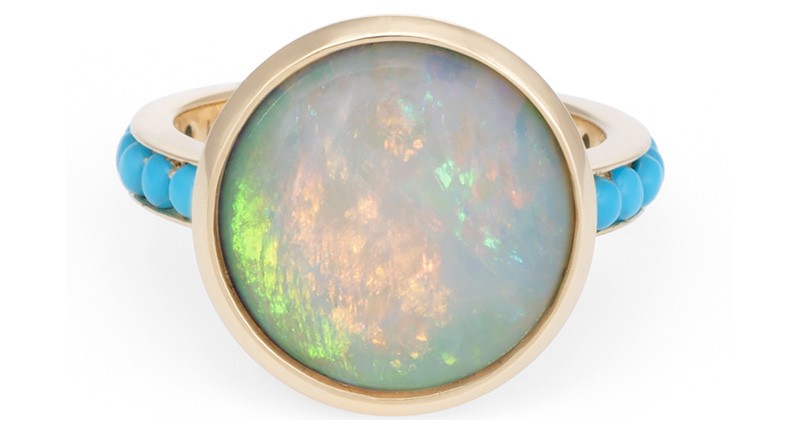 This one-of-a-kind “Ellie” ring by Pamela Froman features a blue-green Lightning Ridge black opal set in 18-karat white gold and framed by a double halo of diamond pavé ($15,400). A series of unfortunate events has given opal the reputation of being a bad-luck gemstone.