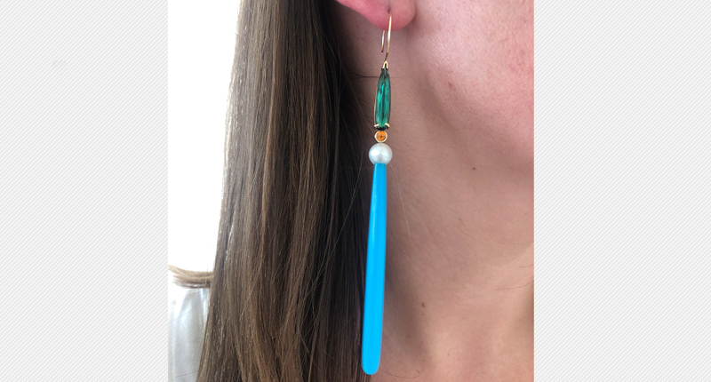 The Laguna agate drops were glowing in the sunlit loft on Editors’ Day, calling to me with their vibrancy. I love how sleek and simple they are while still providing amazing color and an interesting pairing of stones—agate (45 carats total), green tourmaline (6.33 carats), akoya cultured pearls and .22 carats of yellow sapphire.