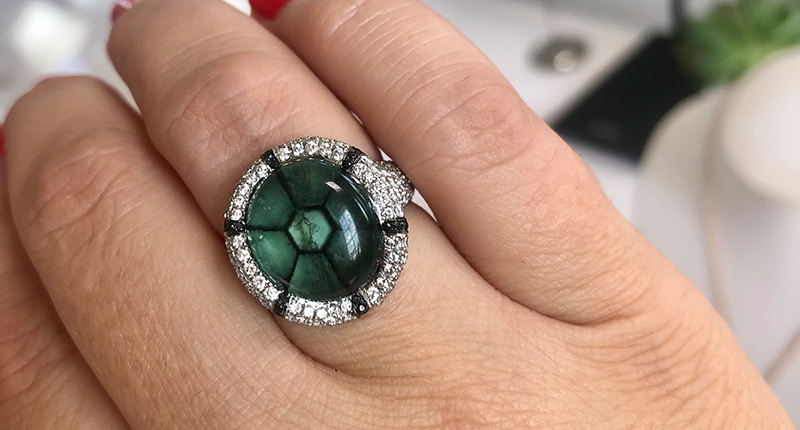 I love the way the design of this ring worked with the “spokes” of the trapiche emerald. It’s clean and let’s the stone speak for itself—trapiche is a sight to see all on its own—with just enough intrigue as the black and white diamonds continue the pattern with faceted, sparkling brilliance.