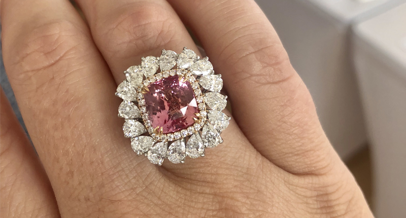 The chances of an Omi piece being among my favorites was high—their stone selection is always on point, and their jewelry always does the perfect job highlighting the stone while giving it the perfect setting. This padparadscha is, in my opinion, the perfect color, especially for a bride, and accenting it with slightly off-set pear-shaped diamonds is the cherry on top of it all.