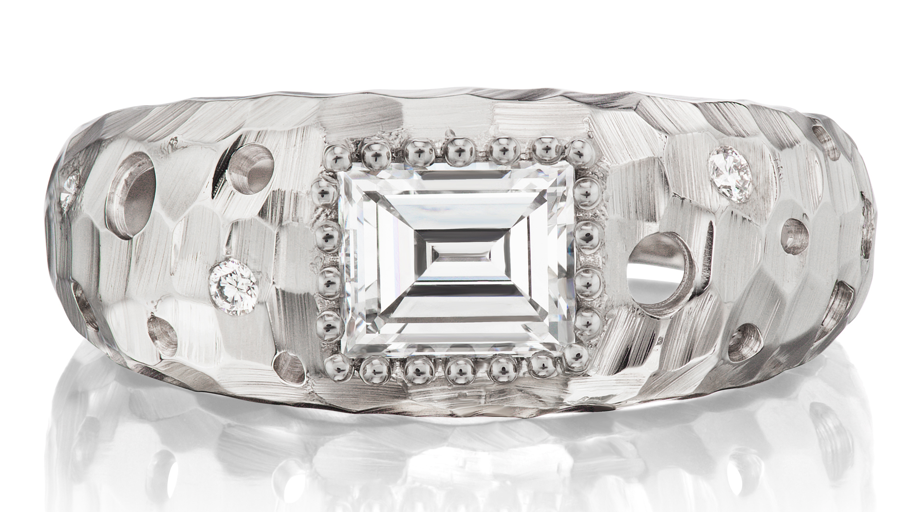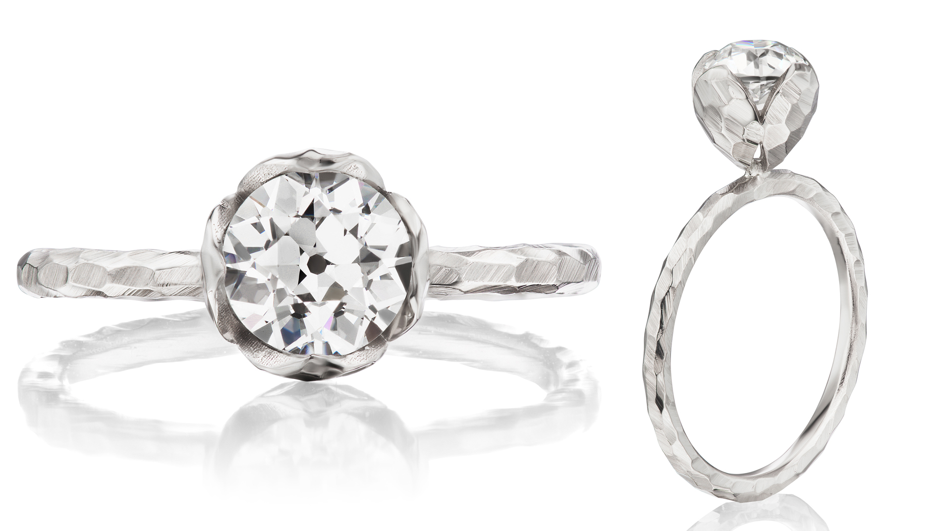 The designer’s first bridal collection, “Love,” combines signature motifs like hammered gold and a unique pronged bezel setting with core brand values like responsible gem sourcing and recycled materials.