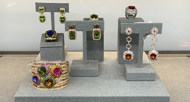 The candy-colored jewelry from Nini Jewels stood out to me, especially an 18-karat yellow gold nine-row “Birdcage” cuff featuring tanzanite, peridot, rubellite, citrine and diamonds.