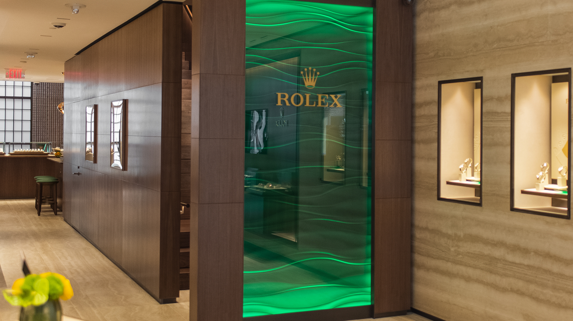 This green color is an accent tone throughout the space, which mixes textures like walnut brown wood, beige-colored stone, and handcrafted stucco panels that imitate the Oyster watch’s fluted bezel.