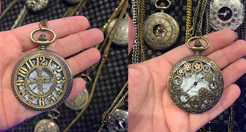 Though the hats are crafted by hand, the pocket watches are from an outside supplier, said a worker behind the booth.