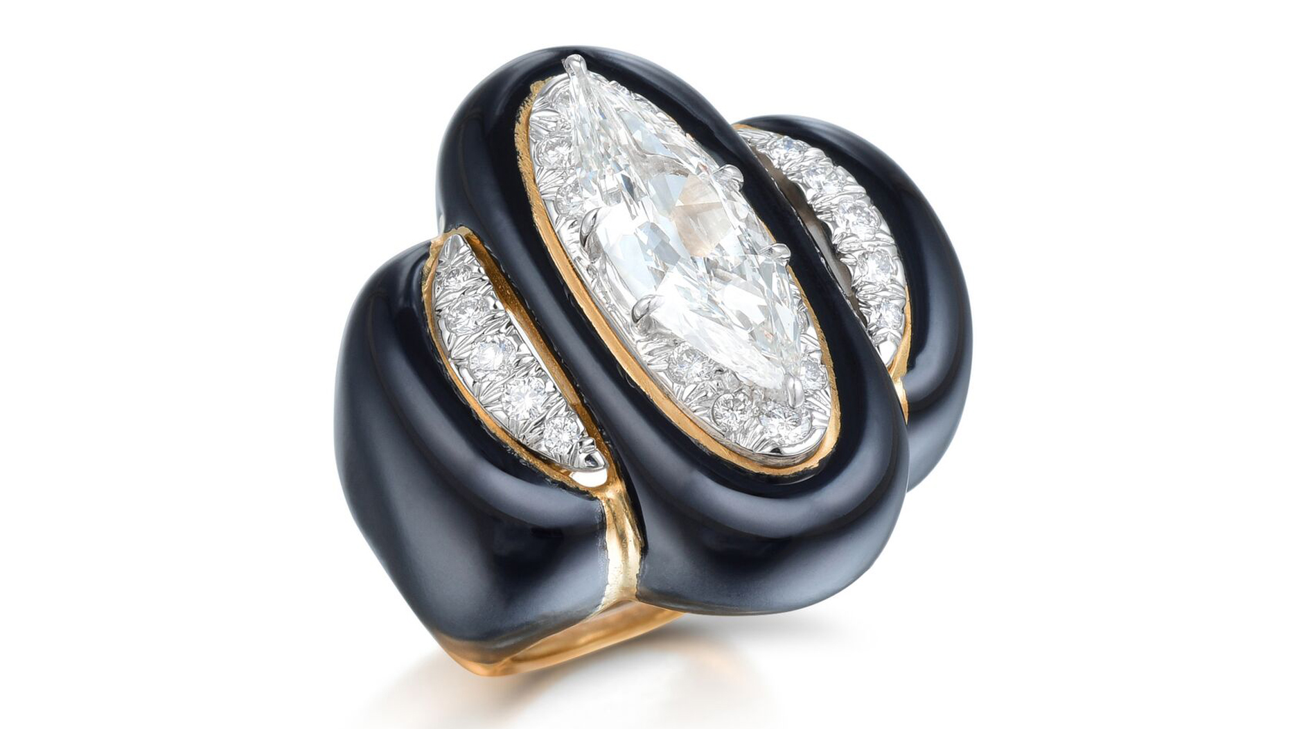 Highlights of her jewelry edit include a citrine, ruby, and gold Buccellati ring ($16,685); a diamond, emerald, and tsavorite garnet Poire Ricci ring from Sotheby’s Diamonds ($55,000); and the diamond and enamel ring from David Webb pictured below ($35,300).