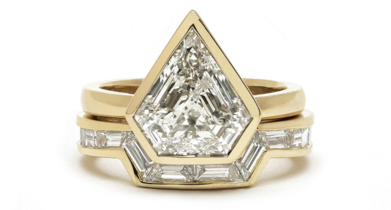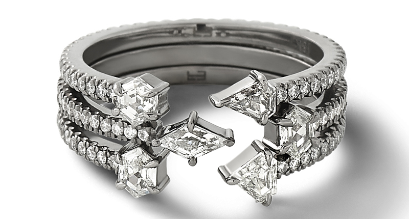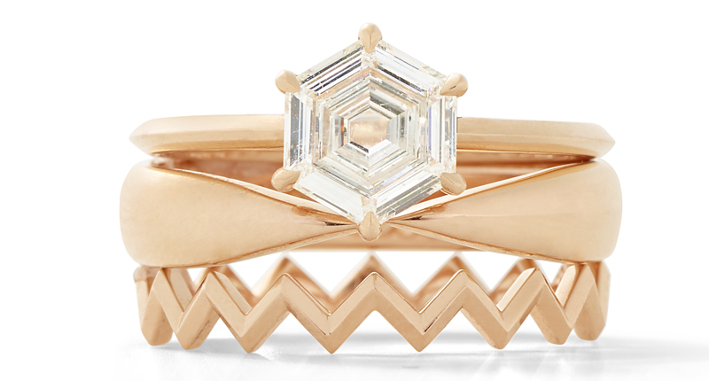 Like her main line, bridal styles stack and nest, are often finished with rhodium, and diamonds typically feature the straight lines of which she’s so fond.
